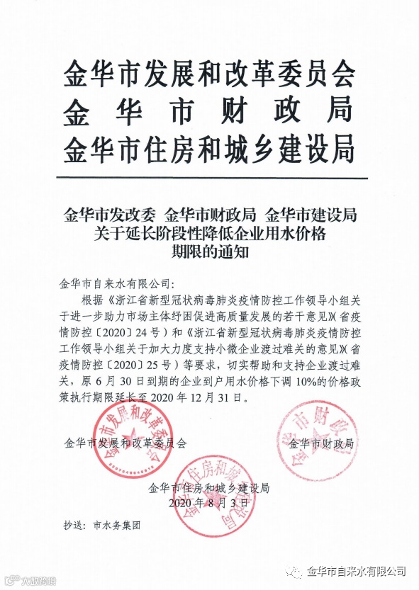 根据金华市发改委、金华市财政局、金华市建设局联合发布的《关于降低企业用水价格的通知》及《关于延长阶段性降低企业用水价格期限的通知》的文件要求,2020年企业到户用水价格下调10%的价格政策执行期限截至12月31日。我公司将于2021年1月对原双月抄表的非居民生活类用水户加抄一期(2020年12月31日之前产生的水费),请用户于2021年1月25日前缴清该加抄产生的水费。2021年1月1日以后产生的用水量将恢复正常水价,期间如有新规定,将按新的规定执行。