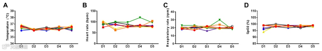 图示:A温度;B心率;C呼吸频率;D COVID-19 患者 hMSC-Exos 雾化干预前后的氧合血红蛋白饱和度。