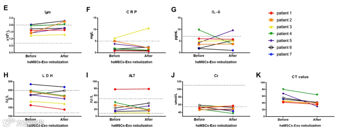 图E-J为COVID-19患者haMSC-Exos 雾化前后实验室参数的动态变化。图K为COVID-19患者haMSC-Exos 雾化前后的胸部CT评分。