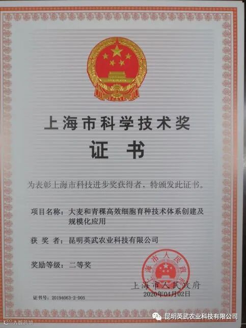 2020年4月02日,昆明英武农业科技有限公司荣获上海市人民政府颁发的“上海市科学技术奖”。