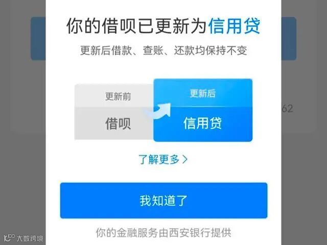 近期不少支付宝用户的“借呗”升级成为了“信用贷”,额度大多得到了大幅提升,究其原因:“借呗”品牌的隔离,让之前与其合作的金融机构有了更大的自主权,从信贷资格的审核、授信额度的审批以及贷后管理,包括征信上报等都由相应的金融服务商独立完成,这才使部分用户的“借呗”额度得到了大幅提升,这也顺应了市场经济的发展规律,把更多的权限交给了市场。