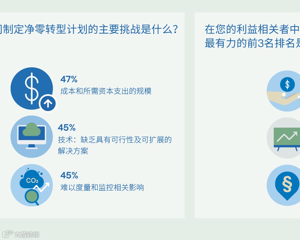 研究表明,全球各行各业的公司大都着力于实现净零排放,并已推动短期过渡计划的落地实施。然而,在此过程中存在着挑战。调查显示,约50%的公司认为成本和所需资本支出的规模是制定净零转型计划的主要挑战,紧随其后的是缺乏可行的技术解决办法、监管方面的挑战以及难以衡量和监测相关影响。
