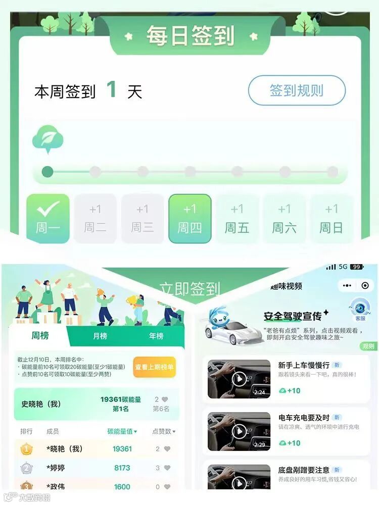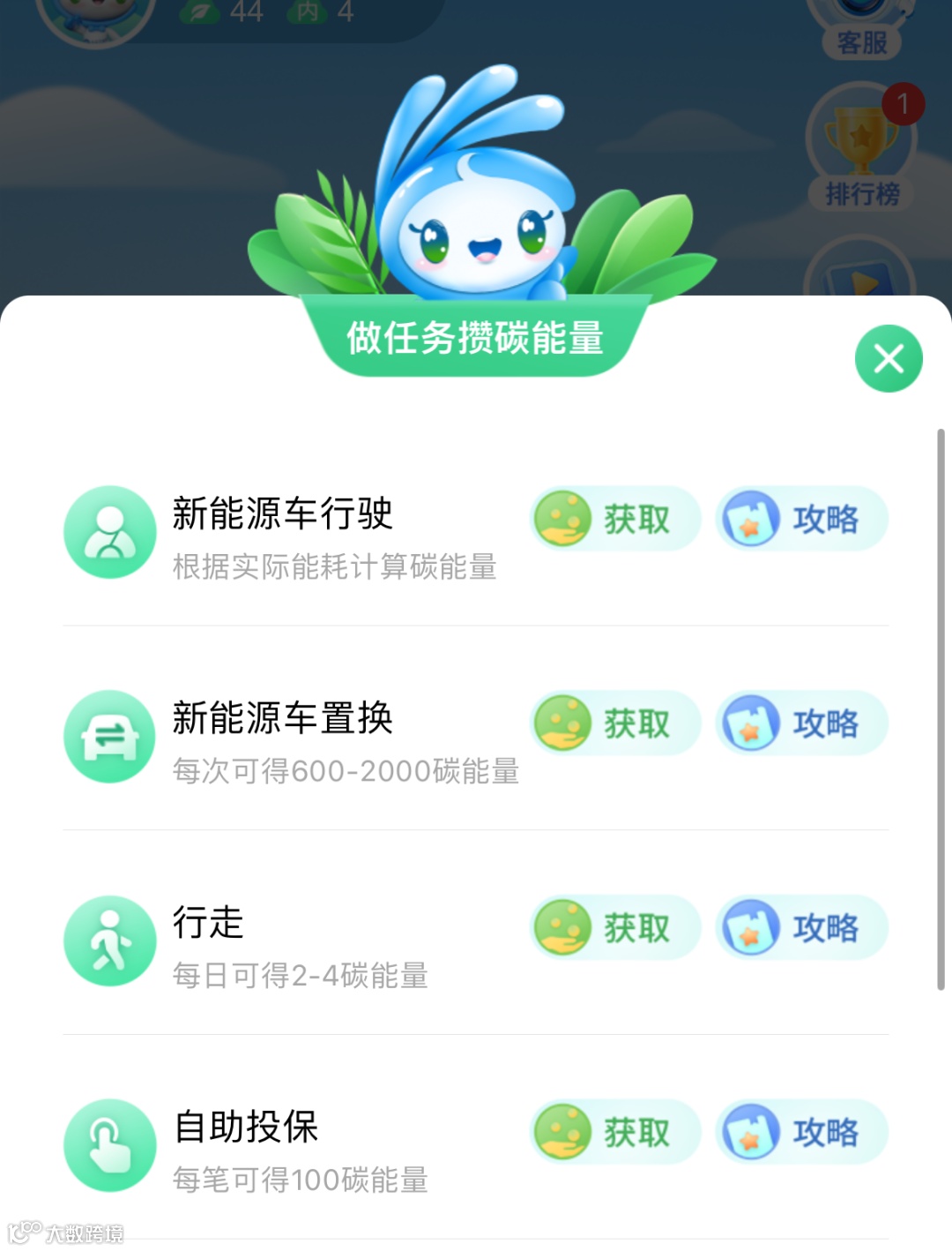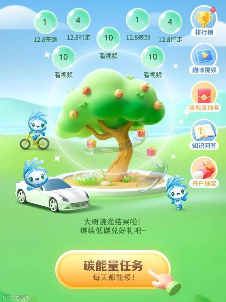 碳能量不够用?别担心!点击“碳能量任务”完成任务,不管是行走、新能源车行驶、安全驾驶等绿色行为都可获得碳能量,电车油车都能参与!天天做,天天领,见证你的每一次低碳行为。