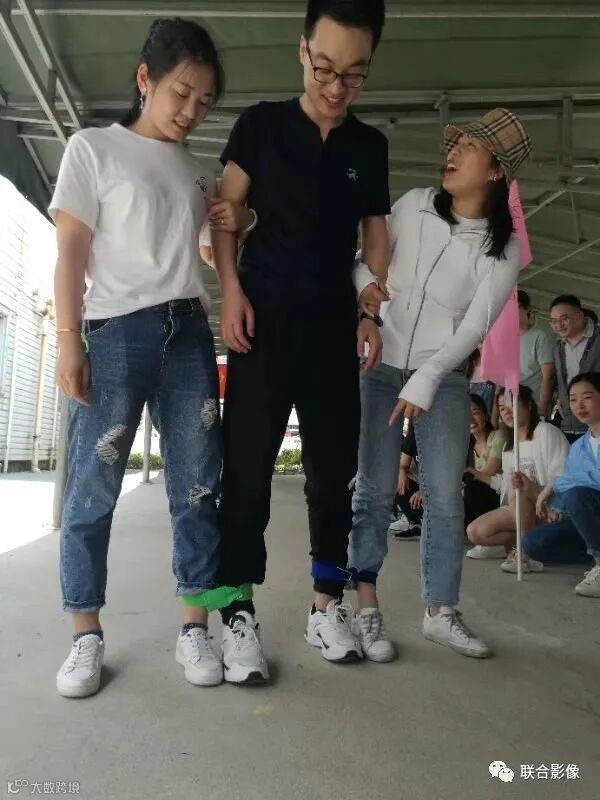 如果说刚才是力量比拼,那接下来更考验的是团队配合。偌大拍成一横排,相邻的人把腿系在一起,一起冲向终点,用的时间较短的胜出,此刻体现团队队员的匹配与信任,提升团队合作能力和协调能力