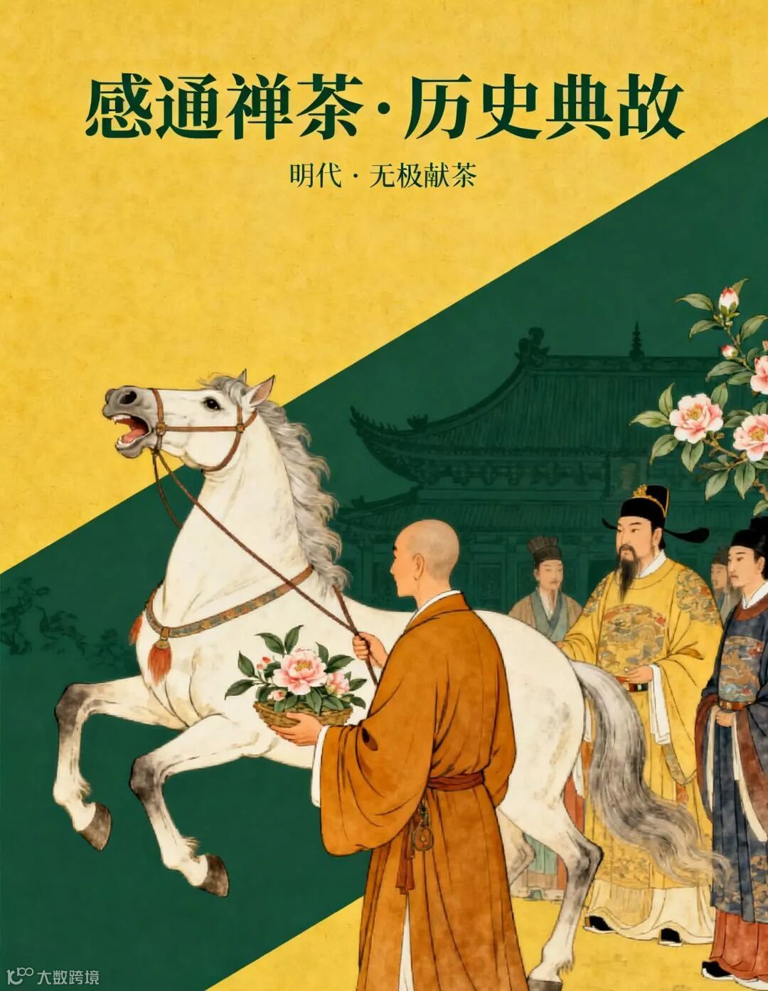 殿前,正当法天禅师献上一株山茶花、一匹白马,和寺产茶叶时,白马突然嘶鸣、山茶花霎时绽放,幽淡清香萦绕大殿之上……