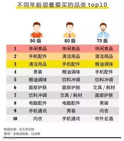 从不同年龄层购买品类的数量看,80后和90后的喜好颇为相似,在零食、手机配件、清洁用品上买的最多。
