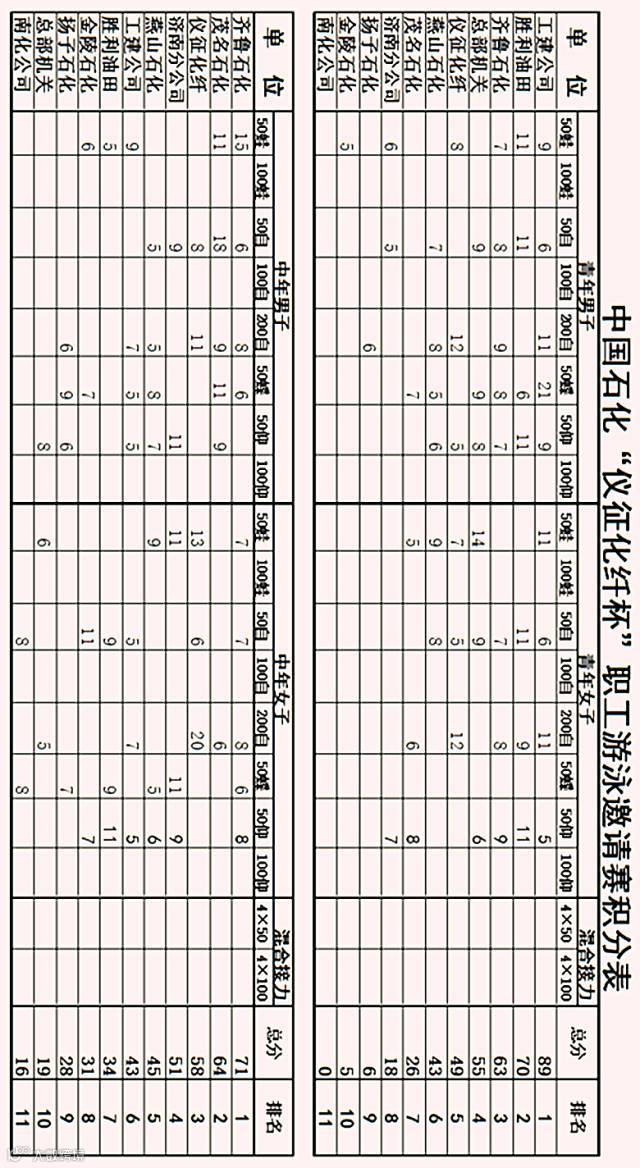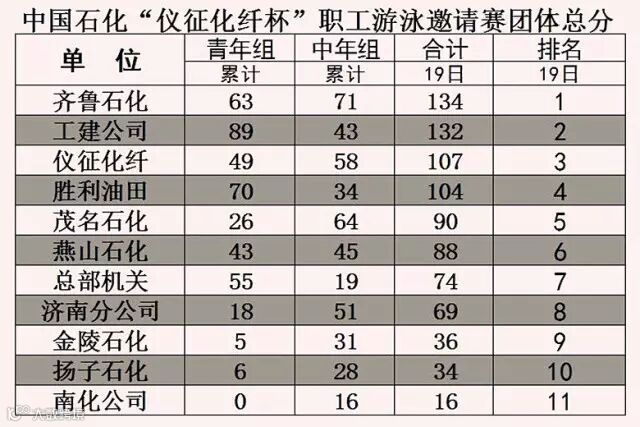 参加此次邀请赛的共有来自集团公司的11支游泳代表队,分别是齐鲁石化、胜利油田、工建公司、燕山石化、茂名石化、总部机关、济南分公司、金陵石化、扬子石化、南化公司和仪征化纤近300名运动员、裁判员和工作人员。