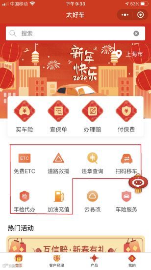 在太好车首页,您还可以领取到丰富的车周边服务,点击“免费ETC”、“违章查询”、“扫码移车”、“年检代办”、“加油充值”入口,即可参与。