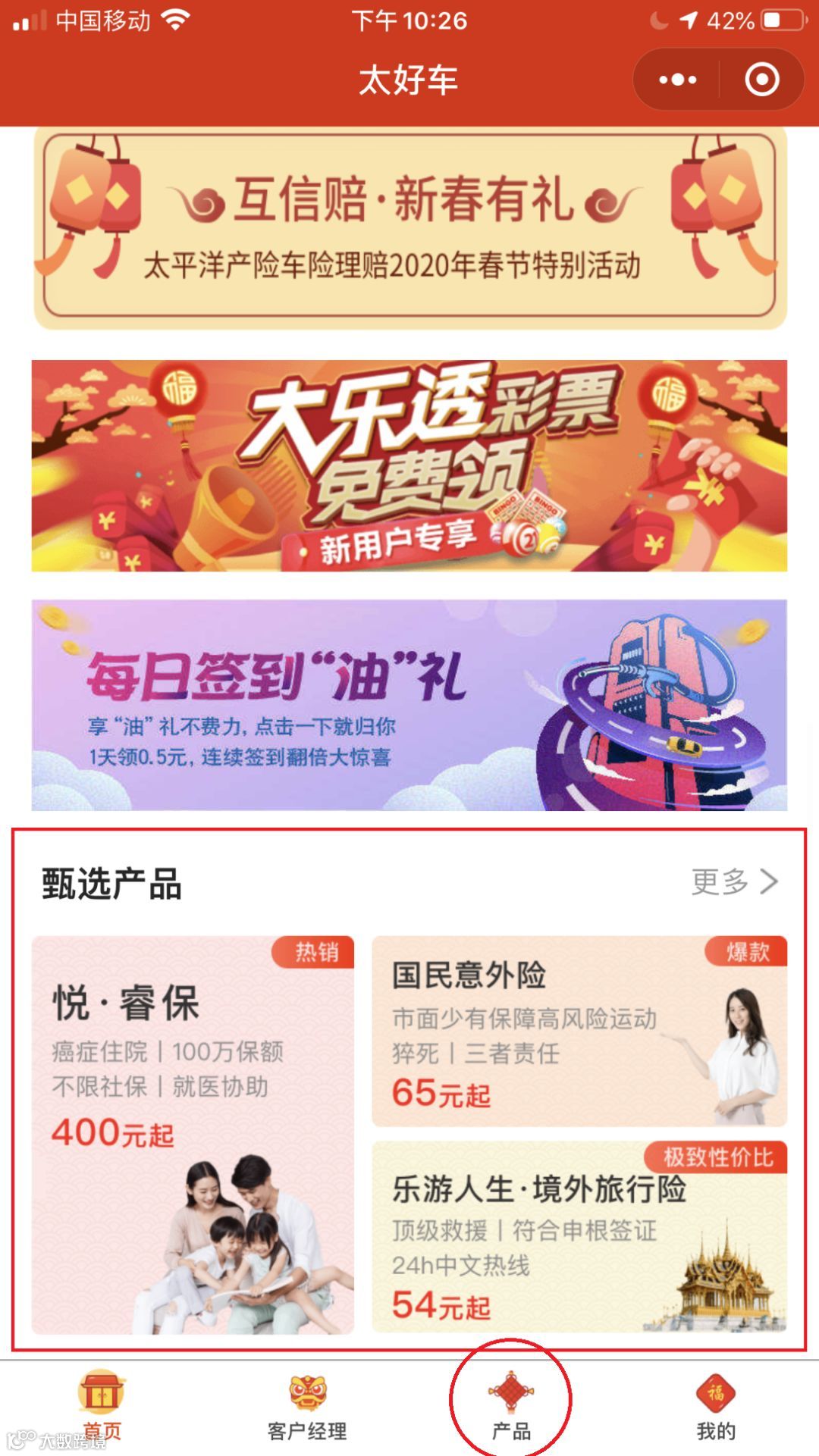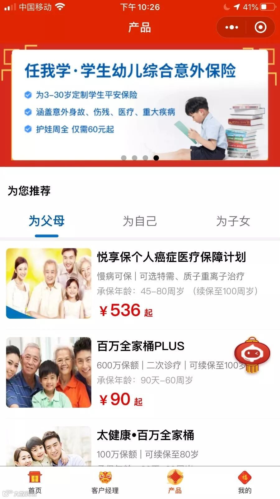 进入太好车首页,至“甄选产品”区域点击“更多>”,或者直接点击首页下方菜单栏“产品”项,即呈上为您甄选的“为父母”、“为子女”、“为自己”各类关怀保障产品。
