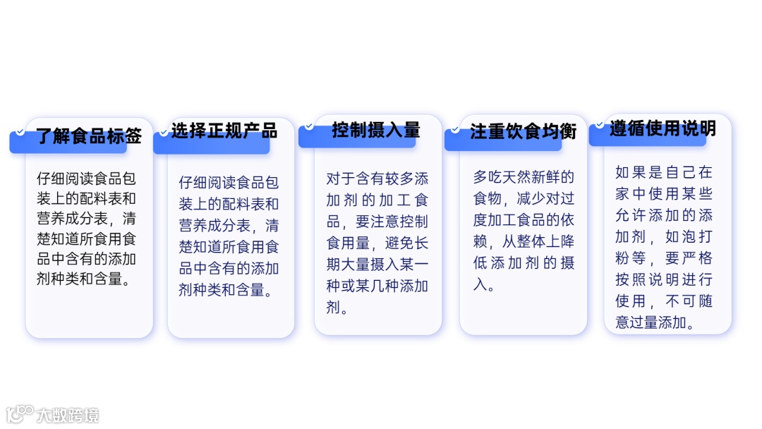 遵循使用说明。如果是自己在家中使用某些允许添加的添加剂,如泡打粉等,要严格按照说明进行使用,不可随意过量添加。