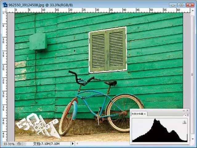可以看到下图的色阶分布图,画素几乎都集中在中间调的附近,暗调和高光部分的画素少得可怜。因此这幅照片缺乏的是对比度,致使照片看起来没有层次感。
