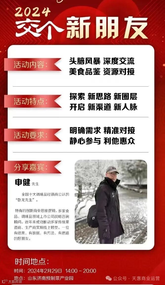 导读:聚力赋能,共同进步2024年2月29日下午,山东(济南)预制菜产业园举办了首届2024“交个新朋友”智慧沙龙活