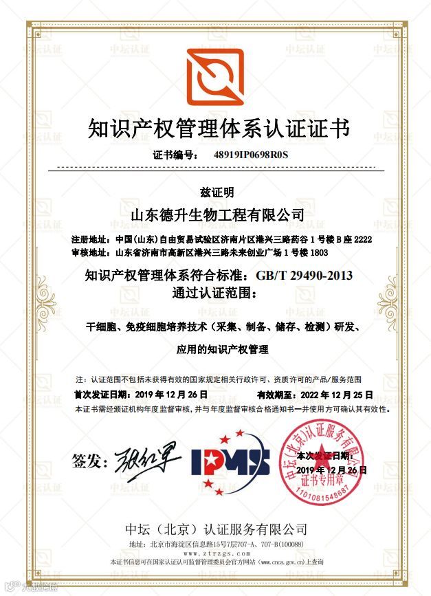 热烈祝贺德升生物获得知识产权管理体系认证证书