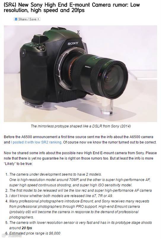 根据谍报网站SAR的高可信度消息显示,索尼的新款微单A9(暂定名)将会分为两个不同版本。一个是之前传闻的7000万像素的高像素机,主打画质,主要用于风光和人像拍摄;另一款则是标准的运动型相机配置,具有低像素、良好的高感表现、更快的对焦速度以及20fps的最高连拍速度等特点。