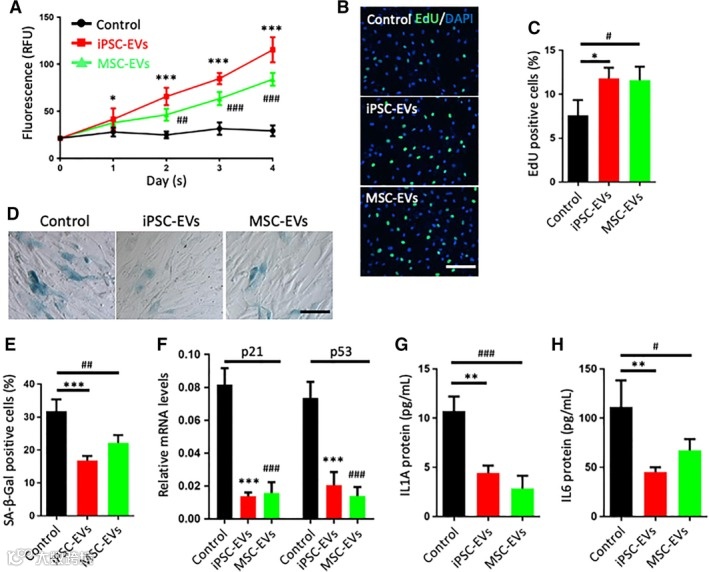 研究使用人类多能干细胞外泌体(iPSCs-Exo)对经过UVB照射以及体外传代30代以上的HDFs进行处理。