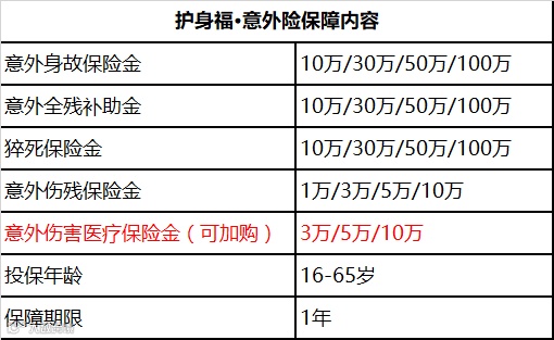护身福·意外险含意外身故、伤残、猝死保障,还可加购意外医疗保险金。意外医疗可以用于平时摔伤碰伤的医疗费用。