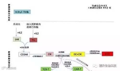 1982年,美国癌症研究所的Rosenberg 发现IL-2刺激的血细胞中产生一类细胞,可以对NK细胞耐受的实体瘤产生杀伤作用,而被命名为淋巴激活杀伤细胞 (lymphokine activated killers, LAK)。1984年11月Rosenberg研究组在美国食品和药品检验局(Us Food and Drug Administration,FDA)批准下,首次应用IL-2与LAK协同治疗肾细胞癌、黑素瘤、肺癌、结肠癌等肿瘤患者。1986年Rosenberg研究组首先报道了用机械处理和酶消化方法,从肿瘤组织中分离出肿瘤浸润的淋巴细胞(tumor infiltrating lymphocyte,TIL),加入IL-2体外培养,这样的淋巴细胞其生长、扩增能力强于LAK细胞,对LAK治疗无效的晚期肿瘤具有一定治疗效果。1989年后,有研究发现CD3抗体对LAK和TIL细胞具有增强的活性,事实也表明CD3AK(Anti-CD3 Antibody induced activated killer cells)细胞有比LAK细胞和TIL细胞更强的扩增及抗肿瘤能力。