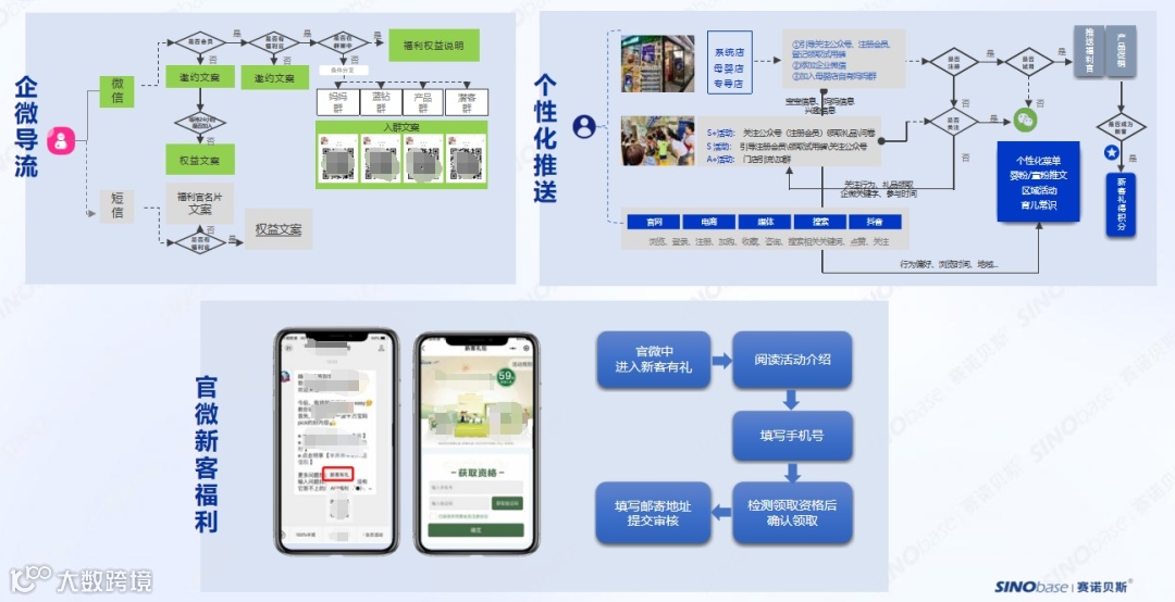 个性化推送:设计了在系统店、母婴店及专导店的入群引导流程,收集妈妈和宝宝的信息,并根据妈妈在官网、电商、媒体、搜索引擎、抖音等的行为信息来实现个性化菜单、婴粉/童粉推文等个性化推送,并根据用户信息来判定是否推送产品促销活动,或关注公众号的提醒,从而实现微信生态下的完整个性化推送。