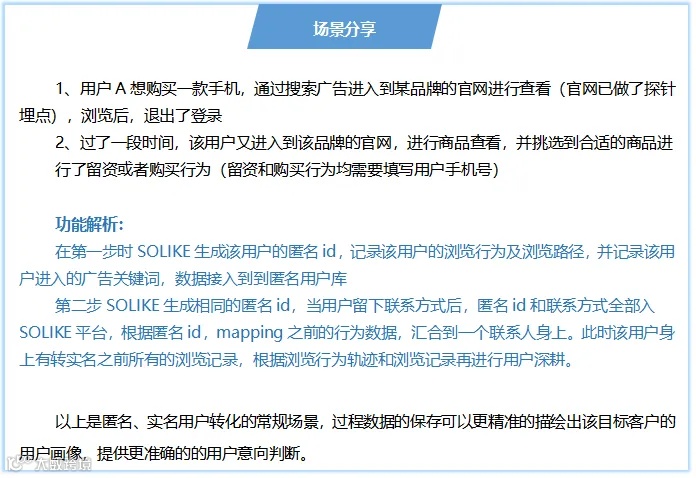 在公域流量中,客户未达到实名转化之前,但已经对某个产品产生了兴趣,那么可能会多次搜索或者浏览公司网页,我们可以将用户在实名转化前每次的浏览行为均记录下来,存储到同一人身上,当用户留下联系方式,转化为实名用户时,将该用户在匿名阶段所有的行为均Mapping到同一用户,以达到所有数据合一,为市场部和运营部提供更多的用户信息。相应的,SOLIKE会记录用户从匿名转实名的时间点,统计当天匿名转到实名的用户数,为某些市场活动提供转化效果依据。