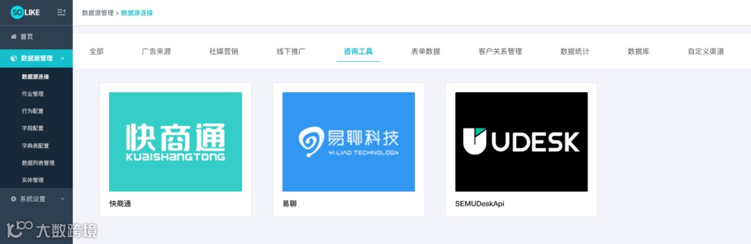 在 “在线咨询工具”的领域,SOLIKE挑选了目前市场份额占比较大的Udesk,进行了API层面的数据打通,目前兼容2套SO底层框架。在数据方面,不仅接入了客户数据、行为数据,还接入了Udesk的工单、业务数据、自定义数据,为用户提供更全面的数据采集。