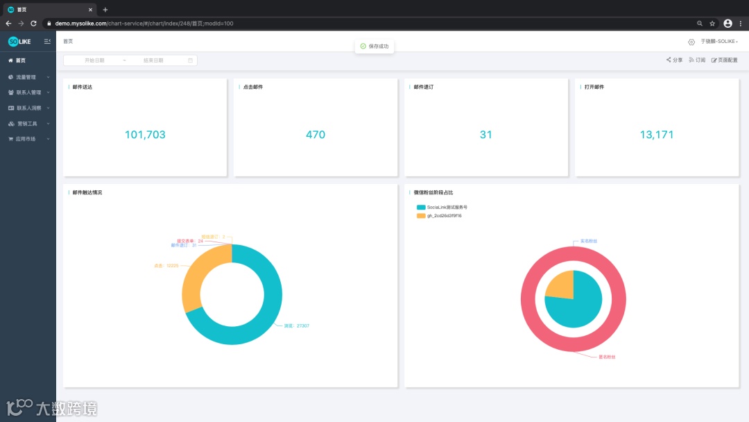 微信粉丝数据接入SOLIKE平台后,根据微信粉丝的业务数据结构,可搭建【粉丝来源报表】,以公众号为第一个分析维度,分析不同公众号下所有的粉丝和实名粉丝数据