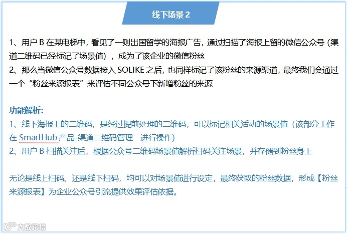 SOLIKE在2020年12月份上线了微信粉丝公域转私域的流量渠道搭建能力,支持所有的第三方落地页制作工具JS埋码,以动态获取公众号渠道二维码,当用户扫描二维码关注公众号的时候,获取粉丝的线上渠道,赋值到粉丝身上,从而得出粉丝的关注来源。