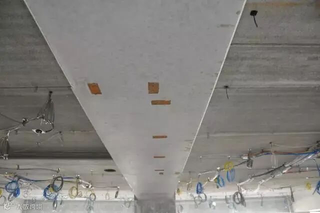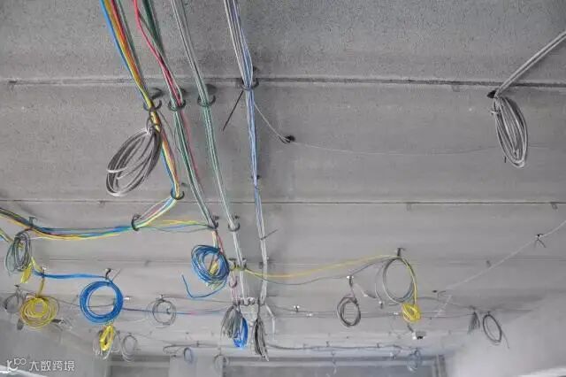 ▲ 挂机电管线的挂钩是直接粘在预制楼板上,不用套管或桥架,五颜六色的线区别不同的功能
