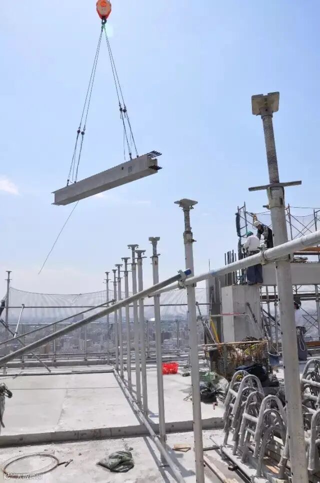 ▲ 我们乘施工电梯刚走到楼上,正好看到刚才地面汽车上的那根预制梁已经吊装上来了,工效真快呀!