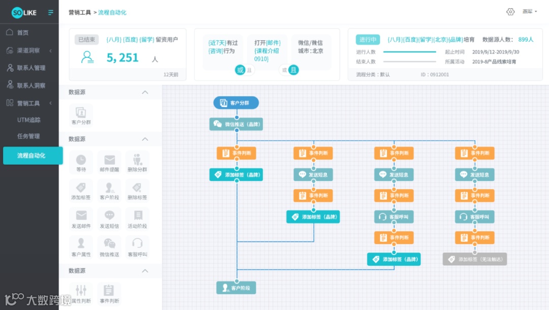 例如用户在刷抖音的时候,看到产品的广告,引起注意,细看下去正好符合其潜在需求,就对产品产生了兴趣,然后用户想深入了解,通过百度搜索相关信息,进而查看更多跟产品相关的信息,比价后进行购买,如果觉得效果好,还会安利给其他人。这里面涉及到的渠道就有抖音、百度等渠道,而你的广告投放链就需要根据这个链路去推广,通过SOLIKE™平台管理看板,可以精准了解到用户在每个阶段,各类标签和画像有哪些,实现提升转化率,提升客户满意度。