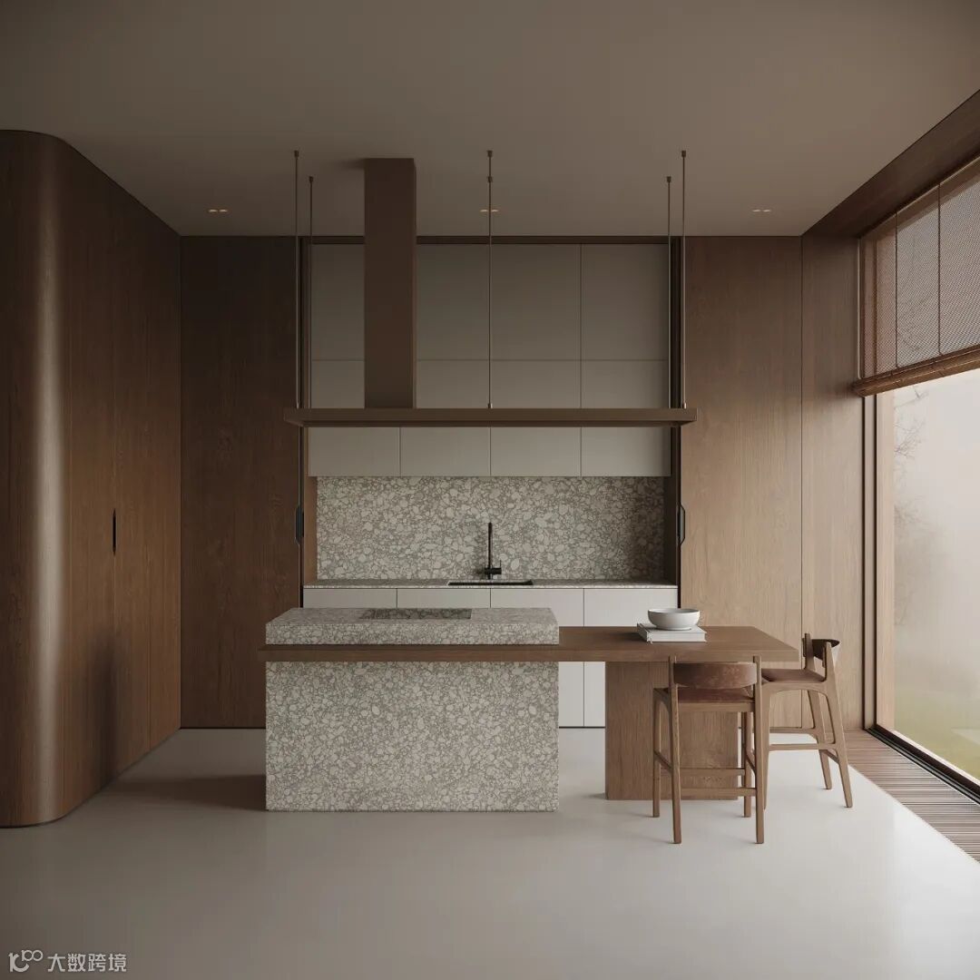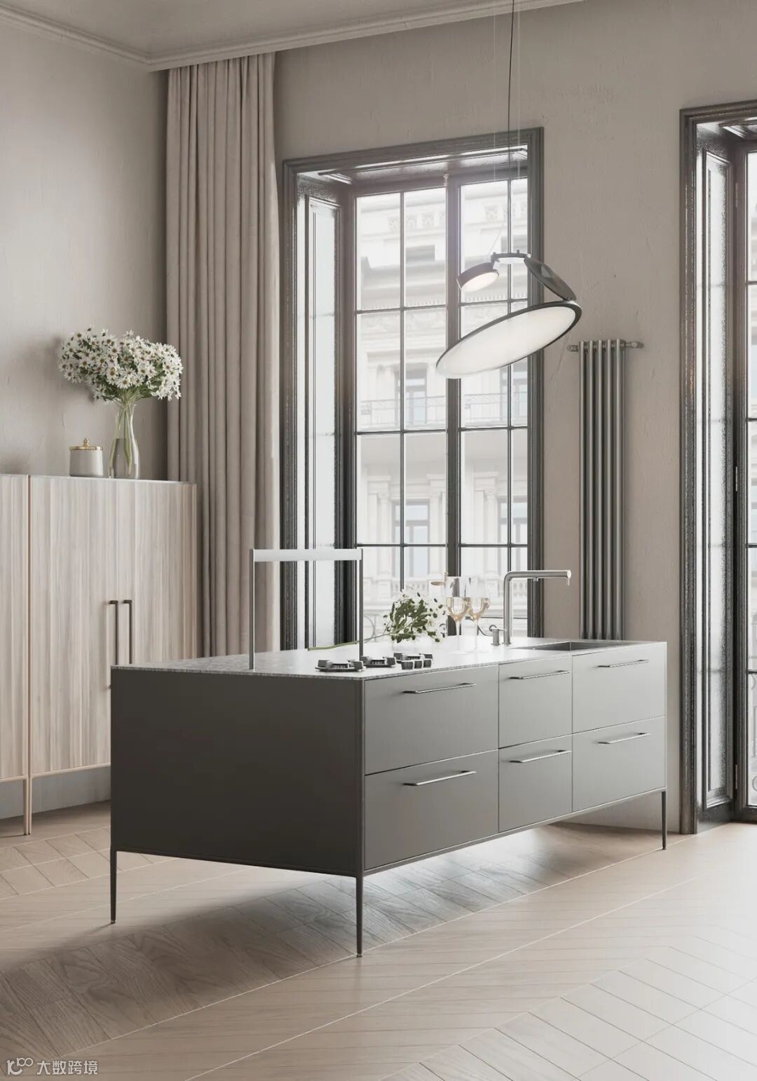 厨房在这个室内项目设计时主要考虑效率和简单。大量的木材在厨房外立面给温暖的室内,而灰色混凝土装饰与极简主义形成对比。融入干净的体贴入微的细节设计,厨房岛作为中央烹饪和社交聚会之地。