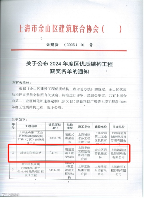 近日,2024年度上海市金山区优质结构项目获奖名单正式发布,建设咨询新建山阳消防站工程总承包项目荣获年度金山区优质结构奖。