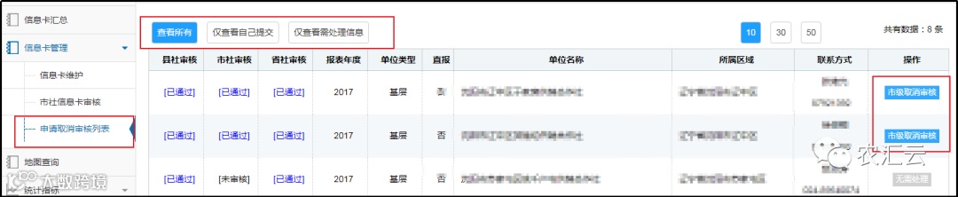 对于已审核的信息卡,县社或直报基层社提交了“修改申请”,省市社可以 统一查看,集中取消审核。