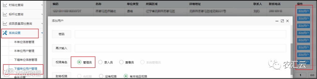 具体路径为:系统设置→下辖单位用户管理→选择需要操作的单位→添加用户→权限选择管理员。