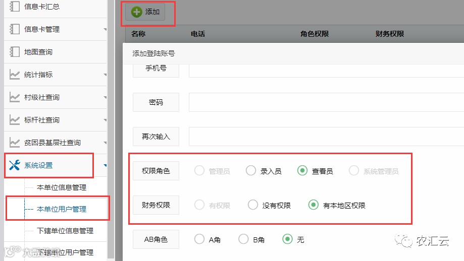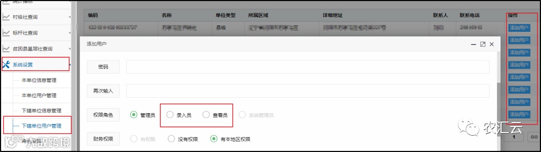 系统设置→下辖单位用户管理→选择需要操作的单位→添加用户→权限选择录入员或查看员。