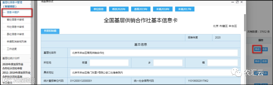 初次进入修改信息卡预设值为纳入2020年统计直报系统的基层供销合作社的部分信息及2019年度本基层社填报的相应信息,在此基层社填报完善2020年度信息卡基本信息。