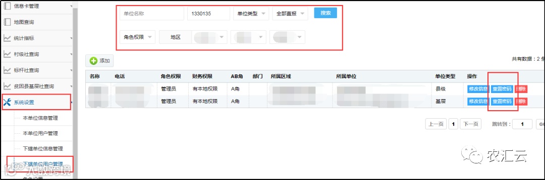 系统设置→下辖单位用户管理→筛选用户→重置密码。