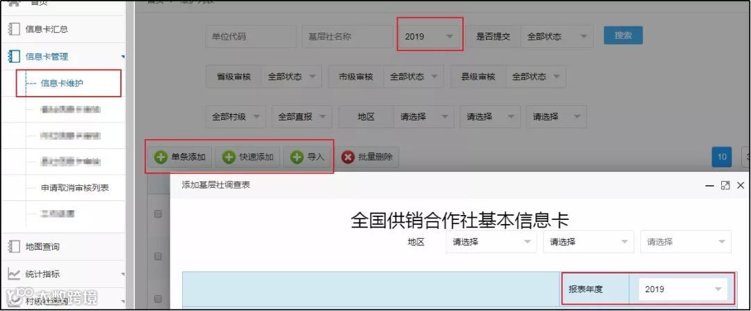 信息卡管理→信息卡维护→选择填报年份(默认当前年份)→快速添加。