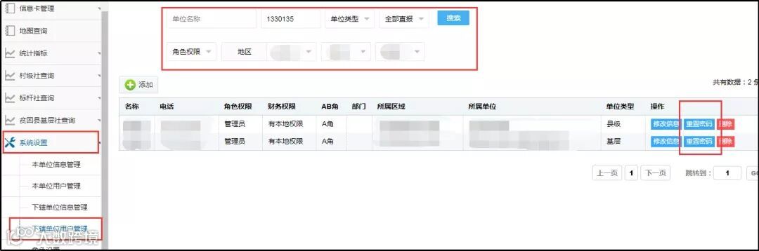 (2) 重置下辖单位用户密码