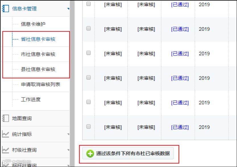 信息卡管理→省/市/县审核→选中需要审核的数据→批量通过审核