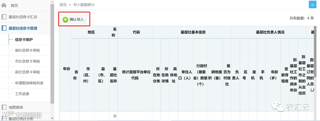 基层社信息卡管理→信息卡维护→导入→选择可填报年份(默认当前年份)→选择年份和整理好的数据表→提交→确认导入。