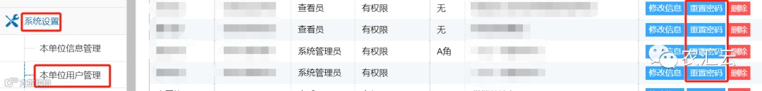 重置本单位操作:系统设置→本单位用户管理→重置密码。