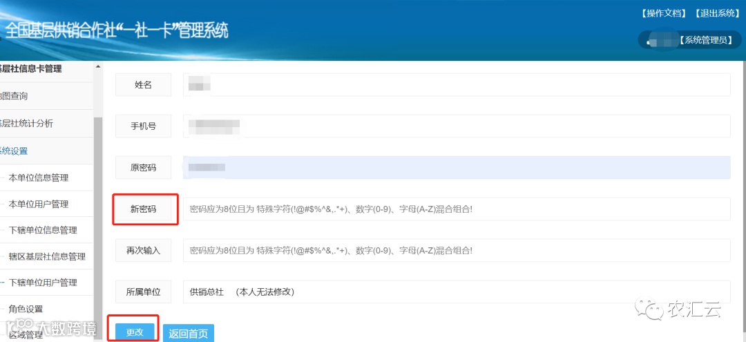 上级单位管理员可为所有管辖内的下级单位录入更改管理员。即省级单位管理员可为管辖范围内的所有市级、县级、基层社添加更改用户,包括管理员和查看员/录入员。
