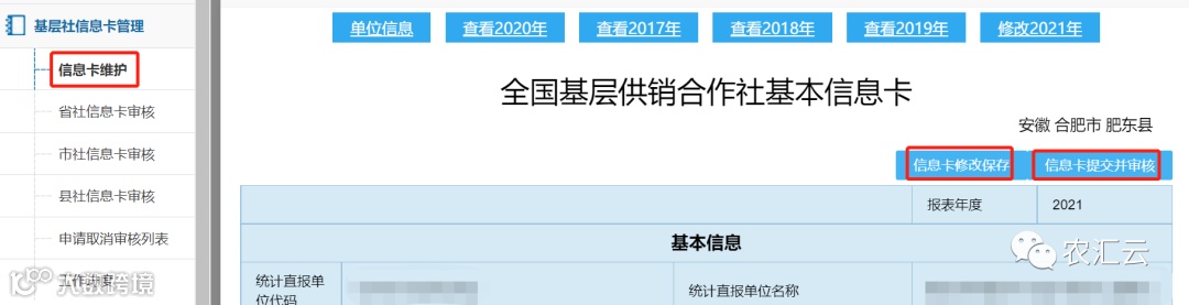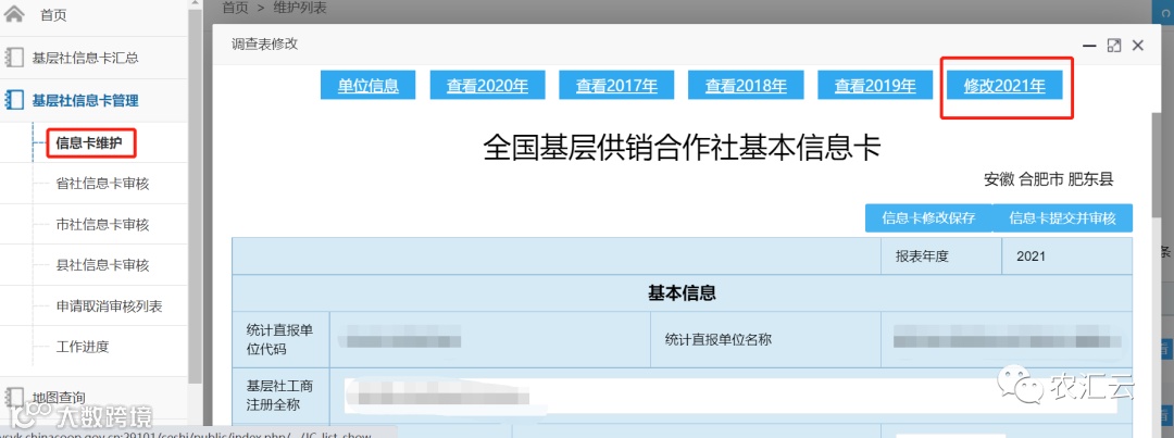 登录系统→基层社信息卡管理→信息卡维护→在列表行选择“修改”按钮进入信息卡修改→填写完整,确认无误后,点击“提交并审核”按钮完成填报。