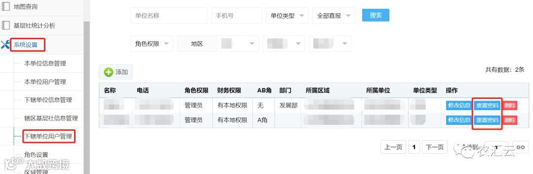 重置下辖单位操作:系统设置→下辖单位用户管理→选择需要操作的单位→筛选用户→重置密码。
