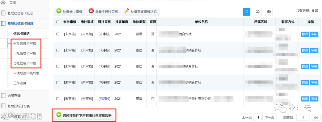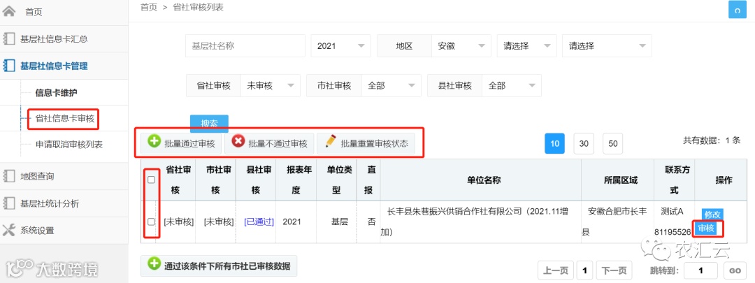 基层社信息卡管理→省/市/县审核→选中需要审核的数据→批量通过审核