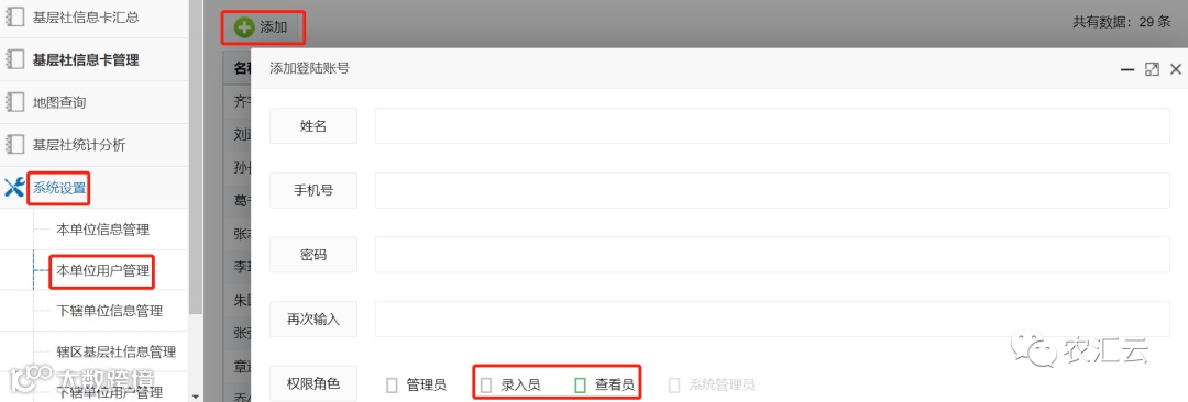 (1) 上级社管理员可以添加更改下辖单位管理员、录入员与查看员