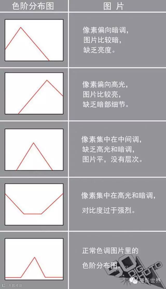 对上面几种情况进行的归纳总结,通过它希望使大家能够明白各种情况出现的原因所在。当然,对于可能接触到的各种拍摄场景,它只是一个简单的参照,里面网罗的也只是几种典型现象。在有些具体的拍摄场景或者特殊的艺术效果面前,上述以色阶分布图来判断曝光的方式未必符合要求,例如:剪影的拍摄,所以应该在拍摄以前进行测光并具体分析才是。