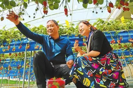 游客在山丹县清泉镇一温室大棚采摘草莓
