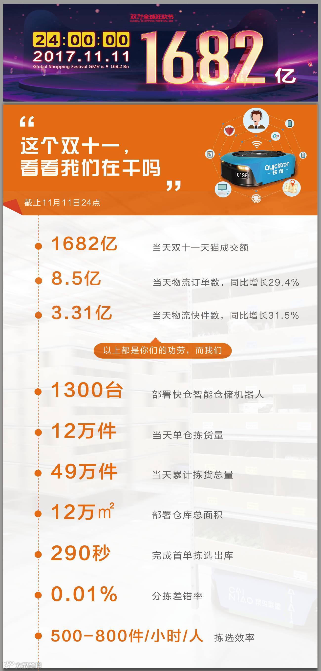 2017年双十一物流呈现多个新特点,其中主要变化是机器人仓库从过去的单点开花走向多项目大规模应用。