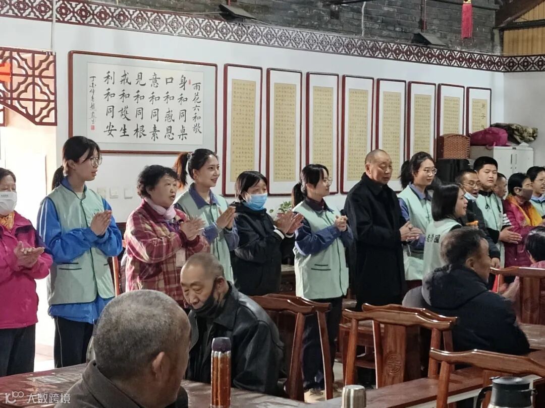 在餐前互动环节中,志愿者们与老人们共做"养生拍拍操",在“一二三四,拍拍肩;二二三四,拍拍腿”的欢快的节奏里,老人们舒展筋骨,笑声不断。当《大中国》的旋律响起,厅堂间流淌着老人们对美好生活的礼赞——在这没有战火纷扰的岁月里,粗茶淡饭也飘散着幸福的馨香。当《映山红》的合唱声响起时,许多老人轻拍着膝盖打拍子,眼角的皱纹中满是笑意,一蔬一饭皆是和平年代岁月静好的见证。
